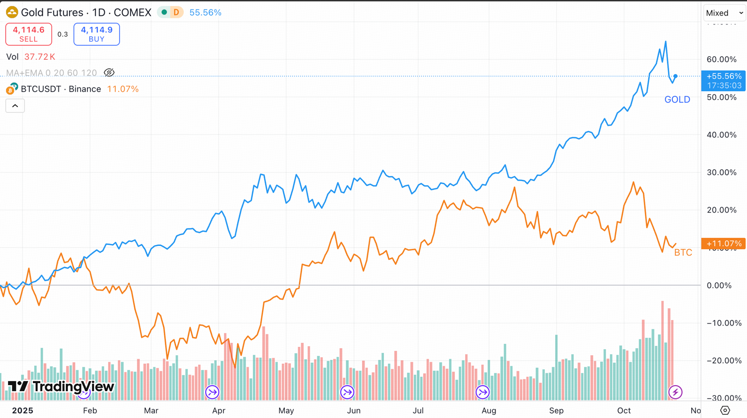 Gold has staged an extraordinary rally in 2025, repeatedly setting new all-time highs. Since the beginning of the year, the price of gold has surged more than 60%, recently breaking above $4,200 per ounce for the first time in history. Bitcoin, often described as “digital gold,” has notably failed to keep pace with this move. This growing divergence naturally raises a critical question for investors: is gold’s explosive performance a leading indicator for Bitcoin, or has Bitcoin structurally decoupled from its traditional inflation-hedge narrative? To answer this, we analyze their respective price trends, long-term correlations, and the macro forces driving demand for scarce assets.